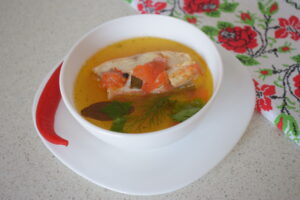 - Bring the water to a boil and when it starts boiling, add the oil, salt, pepper, and vegetables. Let them boil for 10 minutes on low heat and then add the sliced fish, increasing the heat slightly, until it starts boiling. Then leave it on low heat for 15 minutes. The fish is tender and after 25 minutes, the soup is ready. When we turn off the heat, add the green herbs.