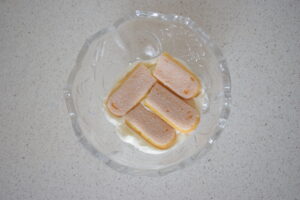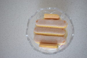 - Place 2 dry ladyfinger biscuits over the cream layer.