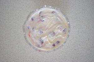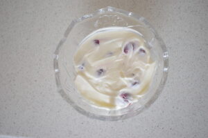 - Spread a thin layer of cream on the bottom of a deep round glass dish.